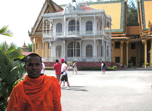 The second day we toured the Royal Palace. The Royal Palace was and is the principle residence of the royal family of Cambodia. When we visited the king was not there, but I would have loved to see him. The grounds are quite large with lots of buildings with stories about both Buddhism and Brahmanism depicted in the sculptures and pictures on the walls. The buildings roofs and towers symbolize prosperity while the yellow and white paint on them symbolize Buddhism (yellow) and Brahmanism (white). Anyway, there are lots of beautiful buildings to see with lots of stories and history to be told and of course, monks to be seen. I’d recommend a visit to the Royal Palace if you visit Phnom Penhm.