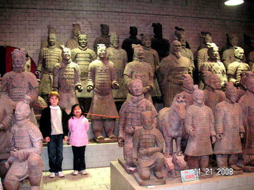 We visited Xi’an in November of 2008 and it was pretty cold! But, it was also not crowded so we could see everything we wanted to see without being rushed. This was an amazing, eye opening experience into China’s history and culture. I wanted to wait one more year to experience this so Sophie would find it interesting but the timing was such that last week worked out much better for us. So after 3 days of touring temples, ancient villages and warriors, both kids came back with a little more Chinese history then the day before. Sean really enjoyed it and learned quite a lot, but he’s always found the warriors fascinating. Sophie did alright picking a 6000+ year old village as her favorite part of the trip.